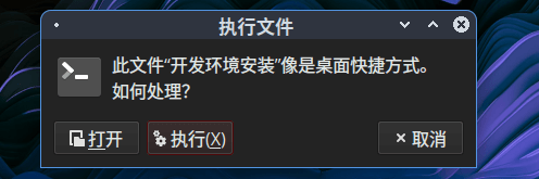 SBCK1Bianbu ROS2. Bianbu ROS Basic Usage2.3 System Dependency Installation2.3 System Dependency Installation 你可以通过桌面图标一键安装 BRDK、JDK、ROS2 所需依赖。 1)双击 开发环境安装 图标: 2)选择 执行: 3)选择相应的依赖安装项,点击 确认 之后会弹出密码验证框,密码为 bianbu。