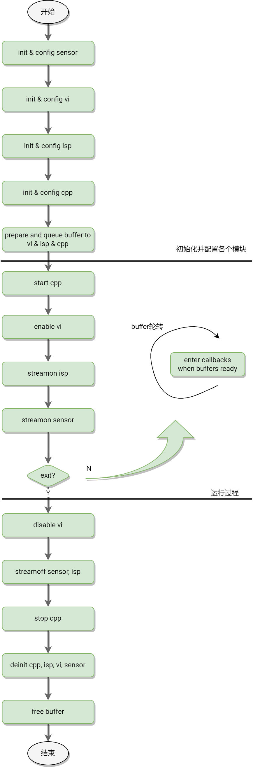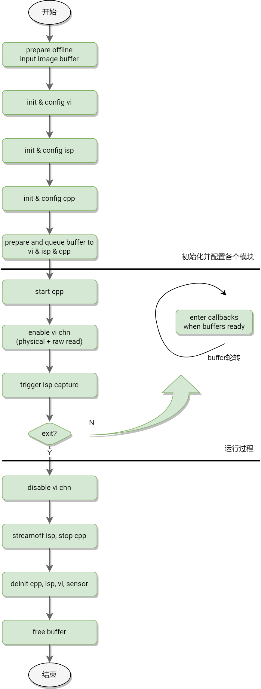 Compared with ISP online, ISP reads input data from DDR, so there are differences in data source configuration and buffer callback, while other parts of the process are basically the same. The following figure shows the ISP capture mode process in offline mode: