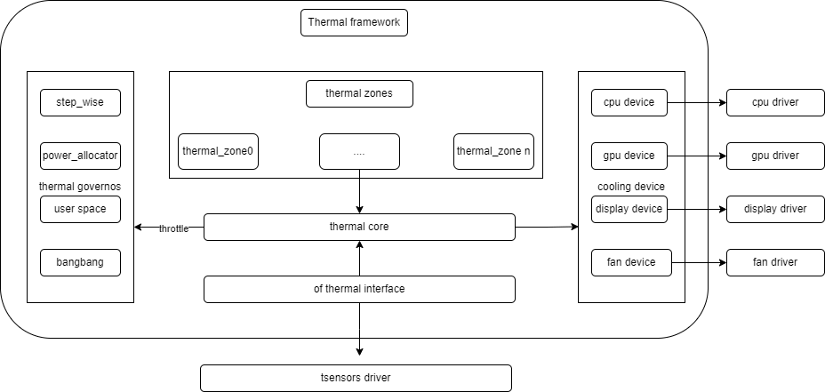 2. thermal core is the main program of thermal, the driver initialization program, maintains the relationship among thermal_zone, governor, and cooling device, and interacts with user space via sysfs