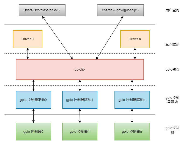 - gpio lib driver: Provides standard APIs for other modules, such as setting GPIO direction, reading and writing GPIO level state